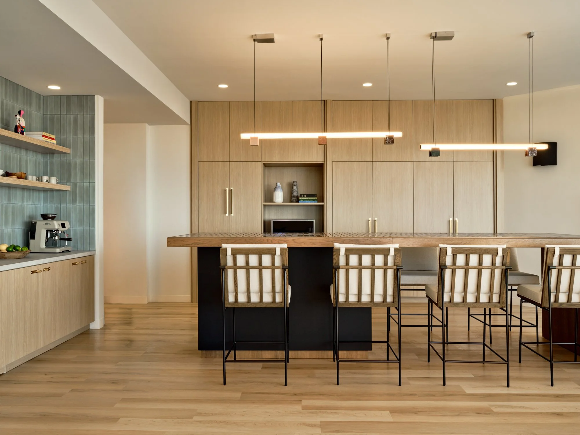 We landed on a design language rooted in LA modernism - clean lines softened by natural materials, careful restraint punctuated by moments of warmth and wit. The palette is confident but never cold. Textured wood, warm stone, and layered lighting keep the space from tipping into corporate anonymity.
